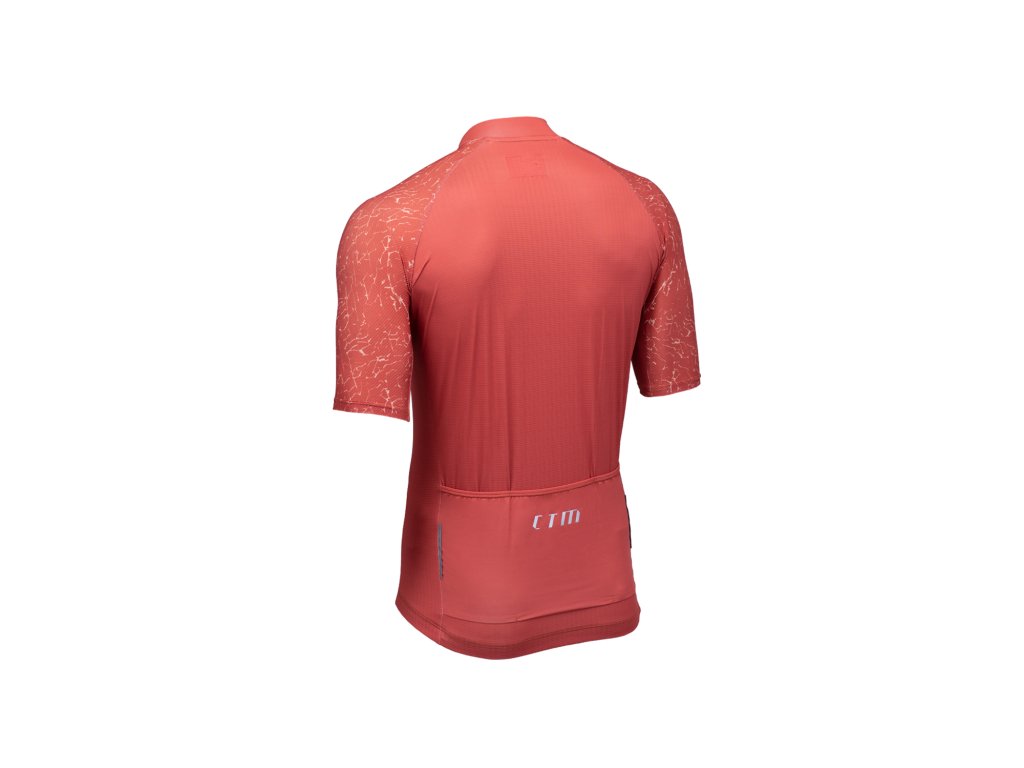 Cestný dres s obtiahnutým strihom a krátkymi rukávmi; Zapínanie: zips s priliehavým nízkym stojačikom; V zadnej časti trojdielne vrecko so všitými reflexnými pásmi po krajoch pre väčšiu bezpečnosť; Elastický spodný lem so silikónovým pásikom na vnútornej strane; Materiál: rýchloschnúca a funkčná zmes recyklovaného talianskeho polyesteru s elastanom; Extra priedušné odvetrávacie panely z jemného materiálu na bokoch a chrbte; Štruktúrovaný materiál na rukávoch výborne odvádza pot; Farba: tehlová červená; Veľkosť: M; Vyrobené na Slovensku