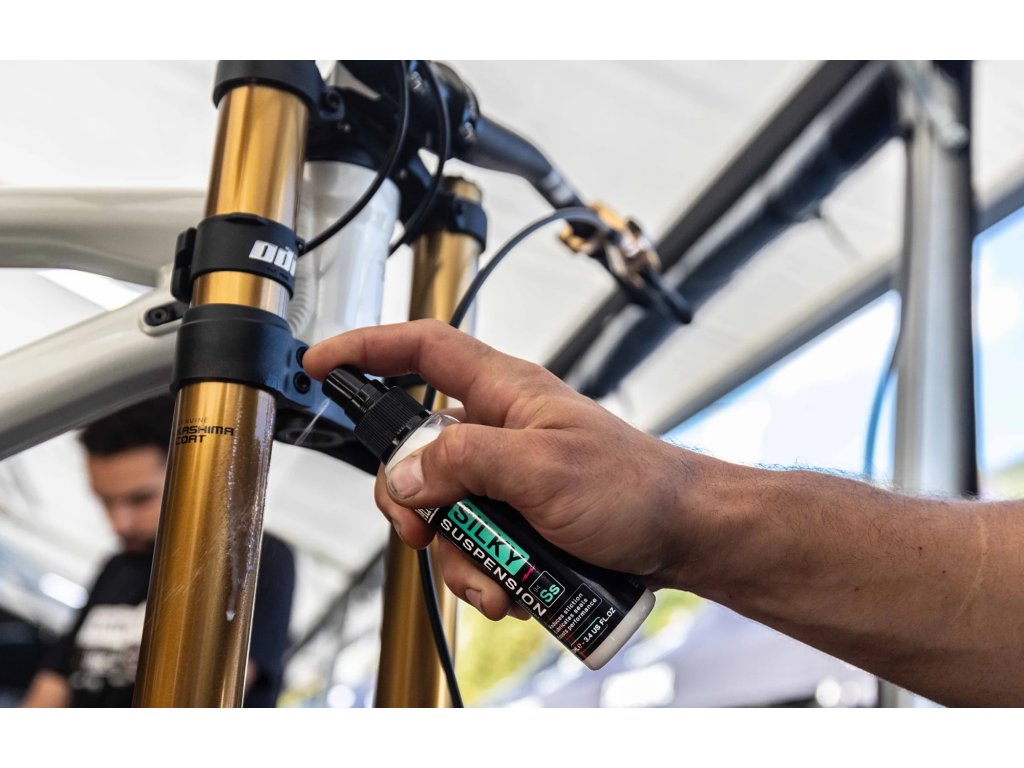 Tento silikónový zázračný vzorec znižuje odpor medzi tesneniami stieračov a stojančekmi a udržiava všetko namazané. Dokonca pomáha odpudzovať špinu, čím udržiava povrch čistejší a znižuje riziko, že sa nečistoty dostanú do tesnení prachoviek a zničia olej vo vidlici aj vašu jazdu.