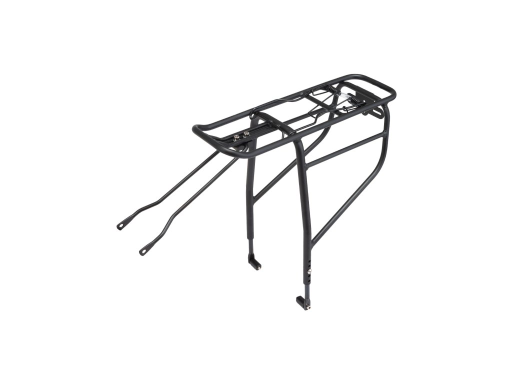 Kvalitný hliníkový nosič s pružinou, ktorý vyniká svojou ľahkosťou a presným spracovaním; Kompatibilný s kotúčovými brzdami při použití hliníkových adaptérov; Výškovo nastaviteľná montáž pre 24'' - 28'' bicykle; Maximálna nosnosť: 25 kg; Váha: 850g; Farba: matná čierna"
