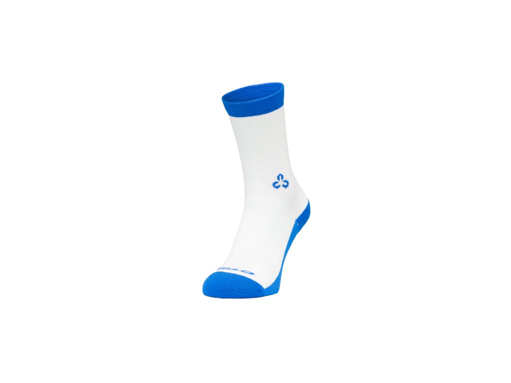 Technické ponožky z polyamidu; Tenké a priedušné so semi-compresným strihom; Zosilnené v oblasti päty a špičky; Tlakové zóny v oblasti nártu a achilovky, ktoré podporujú prúdenie krvi; Výška lýtka 18''; Veľkosť: 34-37; Materiál: Polyamid 93%, Bavlna 7%; Farba: biela-modrá